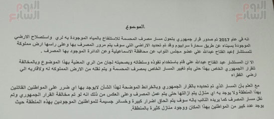 وأشار أحمد محمد أحمد، من الأهالى، إلى أن الرئيس عبد الفتاح السيسي، أصدر القرار الجمهورى رقم 315 لسنة 2017، بإعتبار مصرف المحسمة منفعة عامة، وتم تحديد مسار نقل المياه وتحديد أسماء المتضررين بصرف تعويضات، جرّاء تنفيذ هذا المشروع، إلا أن أصحاب النفوذ يحاولون تغيير مسار هذا المشروع تفاديًا لأراضيهم ونقل مسار الصرف بعيدًا عنهم، وفى حالة تغيير المسار الجديد الذى يحاولون تغييره ستكون مئات المنازل والأراضى فى المسار الجديد، وبذلك سيتم إزالة وتشريد أكثر من 500 أسرة بأطفالها وشيوخها.