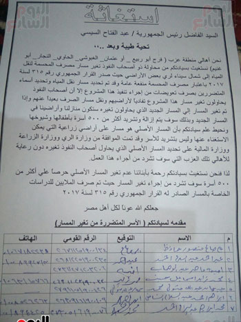 وأضاف صابر الحاوى، أنة فى حالة مخالفة القرار الجمهورى، وتعديل مسار المصرف، فإن ذلك سيلحق أضرارًا كبيرة وخسائر جسيمة للمواطنين الموجودين بهذه المنطقة، لكثرة عدد المنازل فى طريق المسار الجديد، الذى ينوى أصحاب النفوذ تحويل المصرف إليه، مطالبين الرئيس السيسي بالتدخل لإنقاذهم ممن يحاولون تغيير مسار المصرف، دون رعاية لأهالى تلك العزب التى ستشرد.