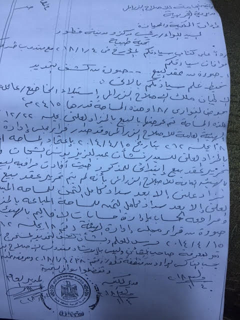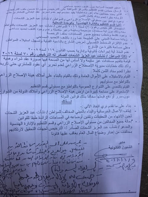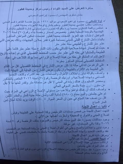وجاء أيضا فى مذكرة الشئون القانونية، أن قسم التنظيم بالإدارة الهندسية بالوحدة المحلية، قام باستصدار الترخيص رقم 70لسنة 2016 للمواطن، بالتواطؤ معه، وذلك بدون أي مستندات صحيحة وسليمة وغير مكتملة، وعدم وجود كشف تحديد مساحى، إلى جانب وجود كشط وشطب بجميع صور المستندات بملف الرخصة، وزيادة مساحة المبنى عن الطبيعة عما ورد بكشف التحديد المساحى، وعدم الالتزام بالمخطط التفصيلي لعرض الشارع بالناحية القبلية، وتسهيل استيلاء المواطن على مساحة كبيرة من الشارع، وعدم اتخاذ أي إجراءات قانونية وإدارية حسب القانون 119لسنة 2008، وتضمنت المذكرة أيضا فى البند ثالثا بالنسبة للمواطن الصادر له الترخيص رقم 70لسنة 2016، إلى قيامه بتقديم مستندات غير سليمة ولا اساس لها من الصحة، فيها صور عقد شراء وهمية، وأكد ذلك خطابات مديرية الإصلاح الزراعي لعدم تحرير أي عقود للمشتري حتى تاريخه، نظرا لعدم سداد الثمن كاملا والقيام بالاستيلاء على الأموال العامة، وذلك للقيام بالبناء على أملاك هيئة الإصلاح الزراعي بالتواطؤ مع مسئوليهم، إلى جانب القيام بالتعدى على الشوارع العمومية بالتواطؤ مع مسئولي قسم التنظيم، والاستحواذ على مساحة كبيرة من أرض هيئة الإصلاح الزراعي وأملاك الدولة من الشوارع دون مبرر أو دفع قيمتها، مخالفا بذلك قوانين الدولة.